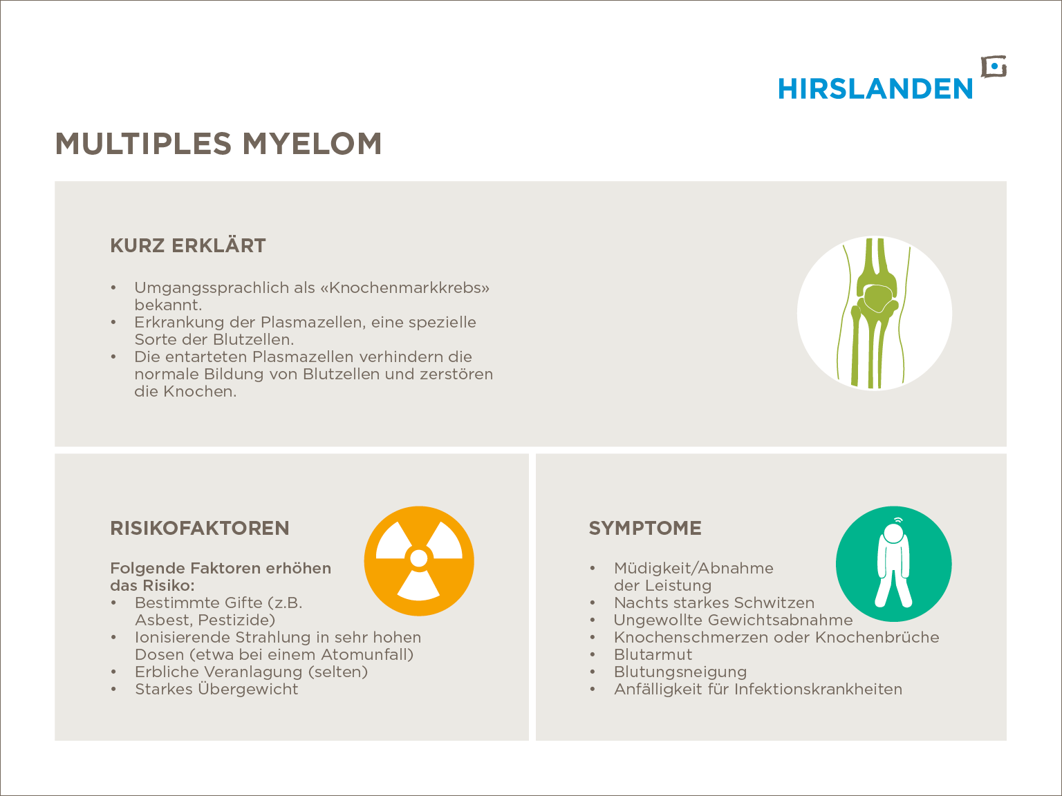 Das Multiple Myelom (auch Plasmazellmyelom, Plasmozytom) ist eine langsam wachsende Krebserkrankung im Knochenmark. Dabei sind die sogenannten Plasmazellen bösartig verändert. Das heisst, sie wuchern ungehindert an mehreren (multiplen) Orten im Knochenmark, beeinträchtigen die normale Blutbildung und zerstören so den Knochen. Therapiemöglichkeiten bei einem Multiplen Myelom umfassen Chemotherapie, Strahlentherapie, Immuntherapie und Stammzellentransplantation. Oft sind zudem orthopädische Eingriffe notwendig, um die zerstörten Knochen zu behandeln.