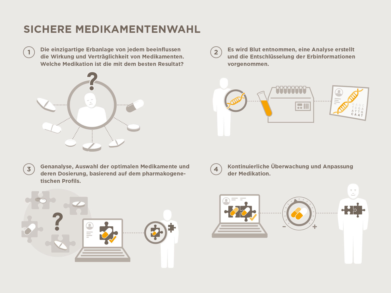 Die genetische Abklärung der Medikamentenwirksamkeit kann entscheidend dazu beitragen, das Risiko eines Therapieversagens oder einer Medikamenten-Unverträglichkeit zu minimieren.