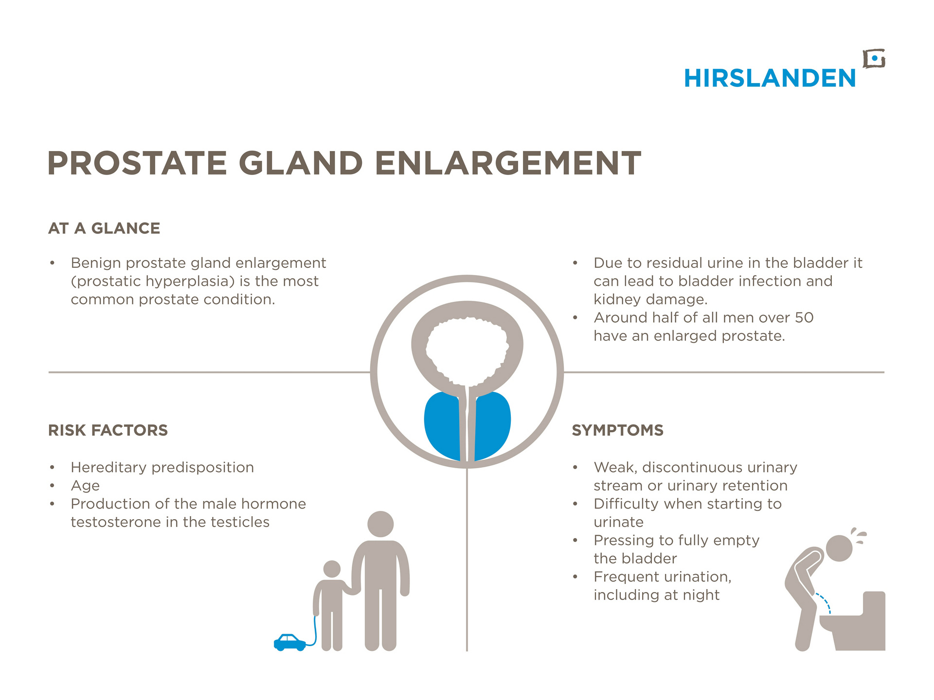 In contrast to prostate cancer, an enlarged prostate (benign prostatic hyperplasia, BPH) is a benign disease of the prostate. It is one of the most common male diseases. From the age of around 50 years old, virtually every second man is more or less affected by it. Typical symptoms of prostate enlargement are symptoms when urinating. Benign prostate enlargement is usually treated with medication. If there is an accumulation of urine in the bladder, surgical removal of the prostate may be necessary.