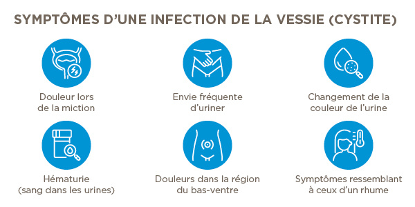 Pour se défendre contre les pathogènes qui se sont infiltrés dans l’organisme, celui-ci réagit en augmentant la production d’urine. En raison de l’inflammation, la vessie et l’urètre se contractent. Les signes typiques d’une cystite non compliquée sont donc :